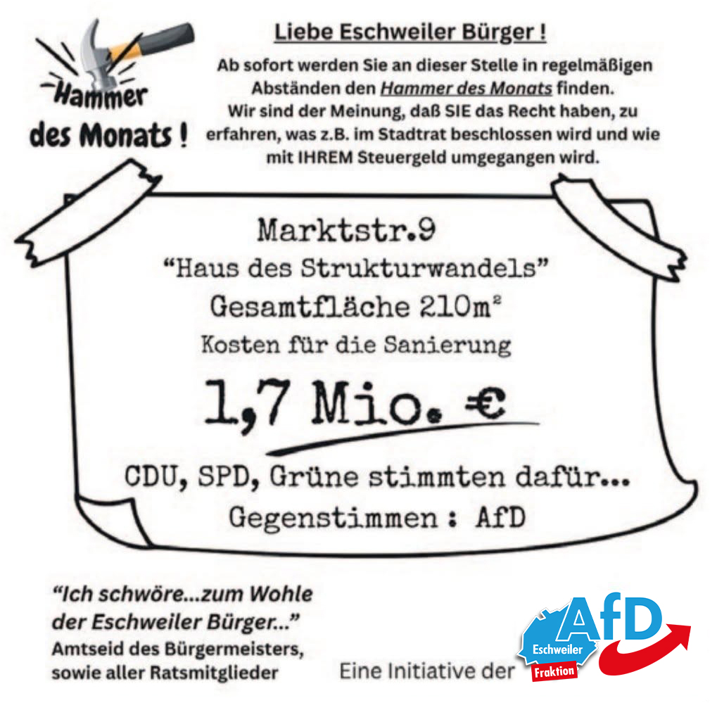 Während viele Eschweiler Bürger jeden Cent zweimal umdrehen müssen, genehmigt sich die Stadtverwaltung mal eben ein Bauprojekt für satte 1.705.000 Euro. Es geht um die „Revitalisierung“ des seit Jahren leerstehenden Gebäudes in der Marktstraße 9